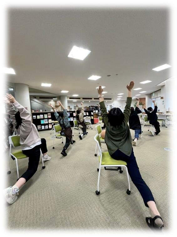 令和7年10月6日(月)10:45~11:30、盛岡大学図書館1階ラーニングコモンズにて「椅子ヨガIn図書館」を実施しました。
