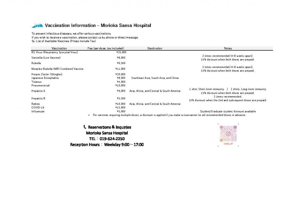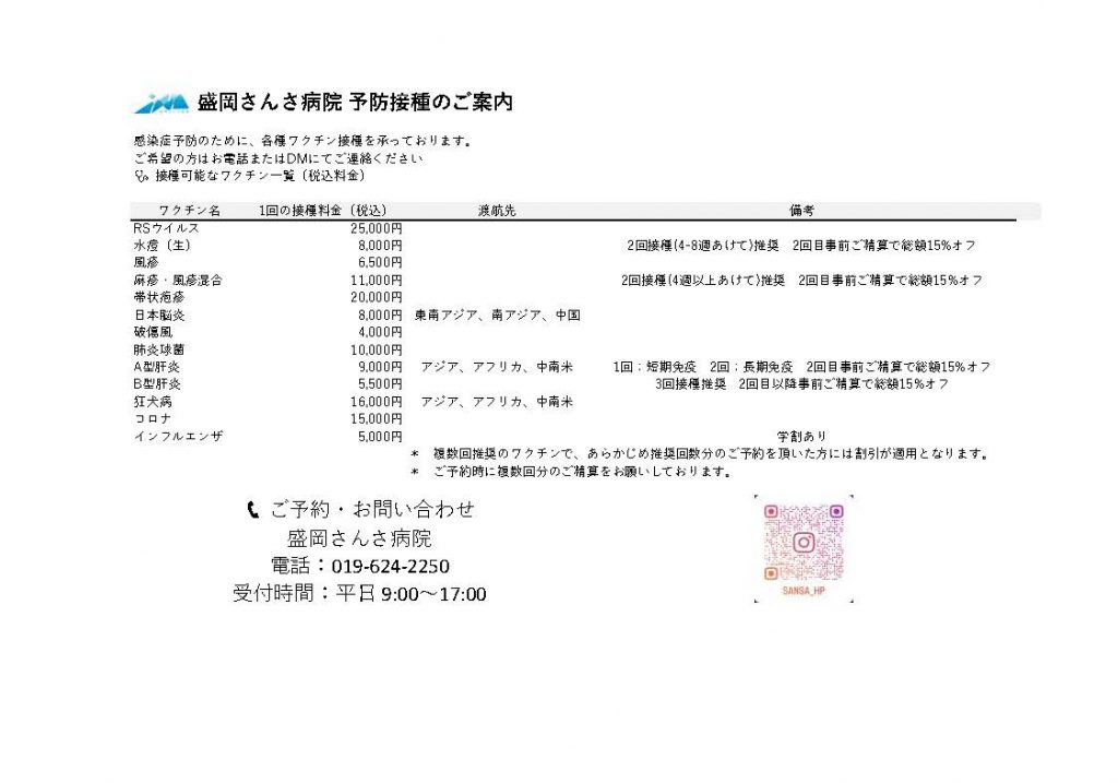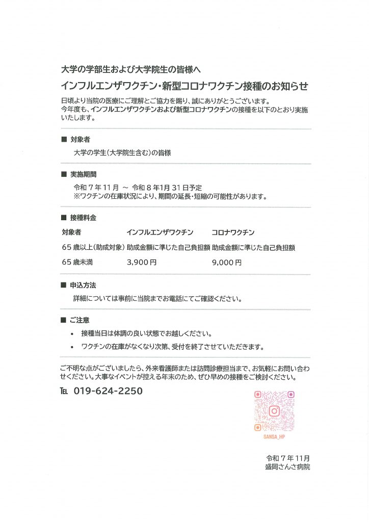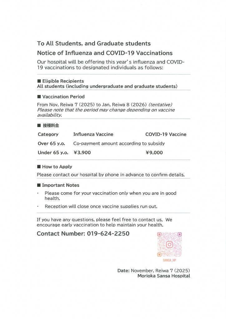 盛岡さんさ病院(旧名称:高松病院)からインフルエンザ・新型コロナ・各種予防接種の案内(英訳あり)がありましたので紹介します。