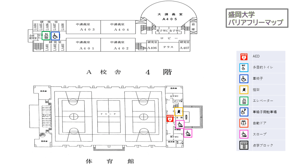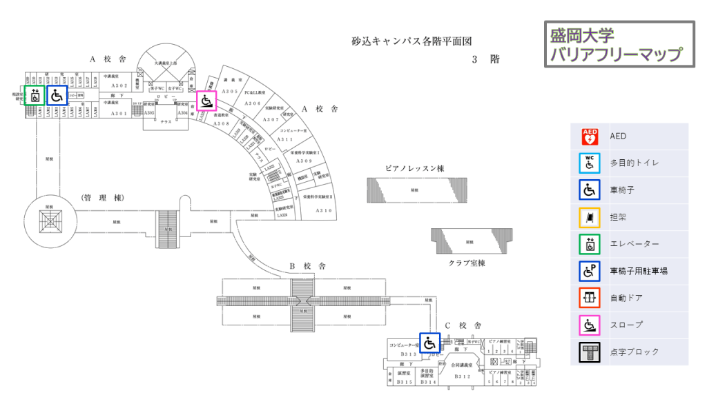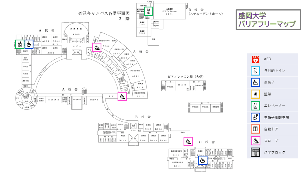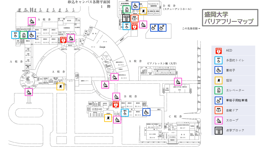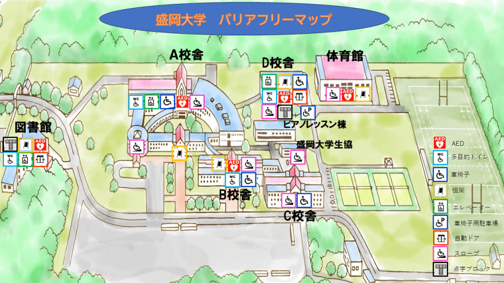 本学では、すべての方が安全かつ快適に学び、働き、訪れることができる環境づくりを推進しています。本バリアフリーマップでは、キャンパス内の移動経路、建物のバリアフリー設備、AEDや担架の位置など、利用者の皆さまに必要な情報を分かりやすく掲載しています。